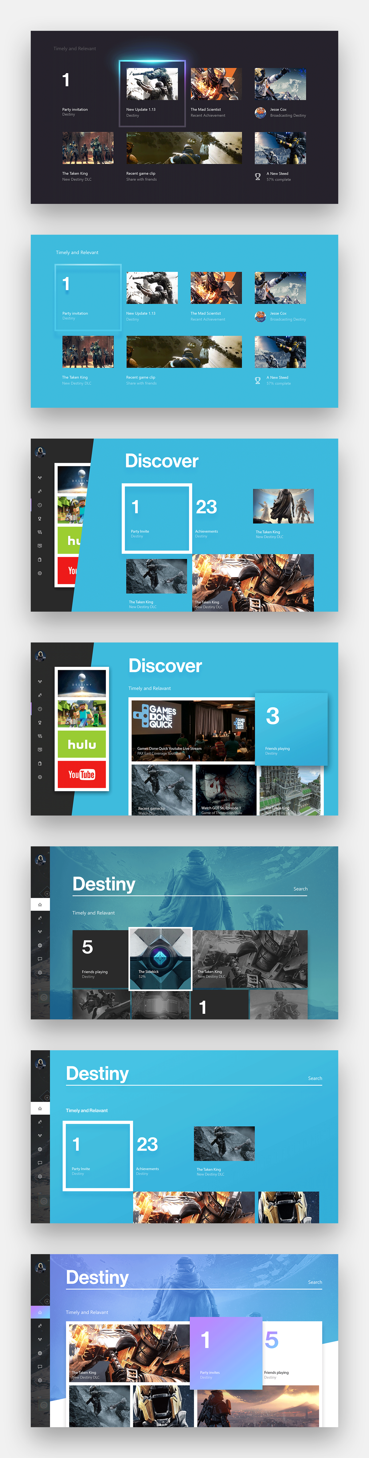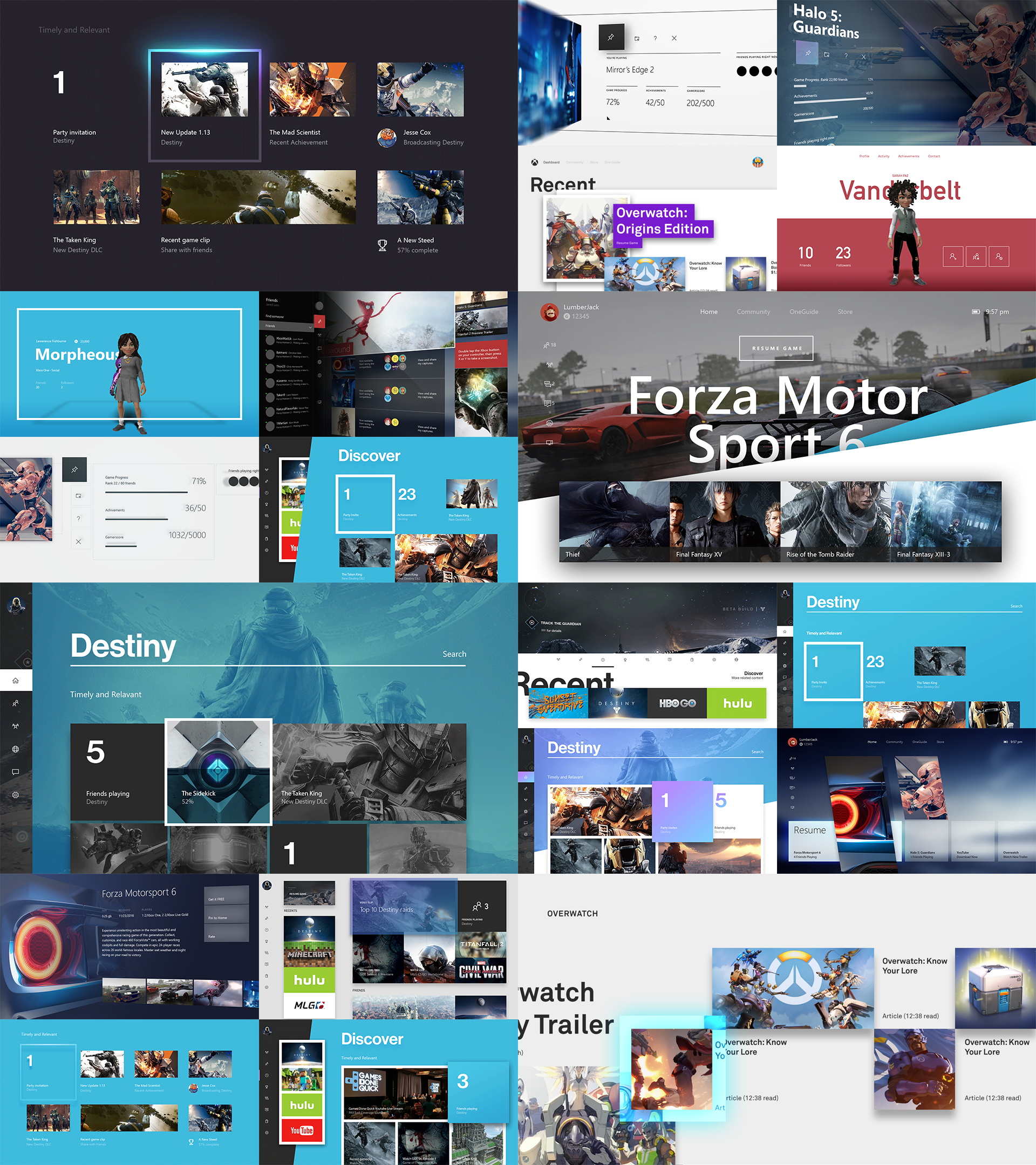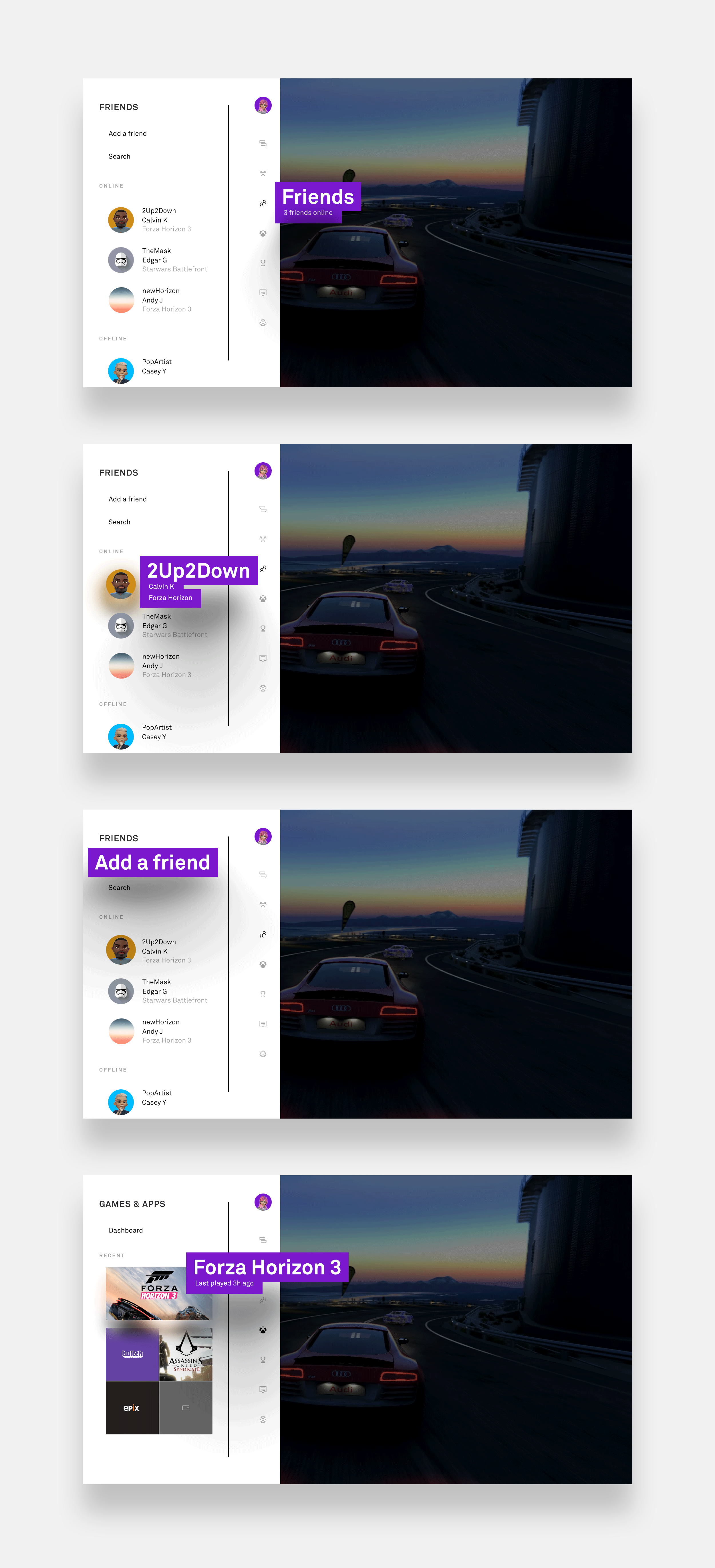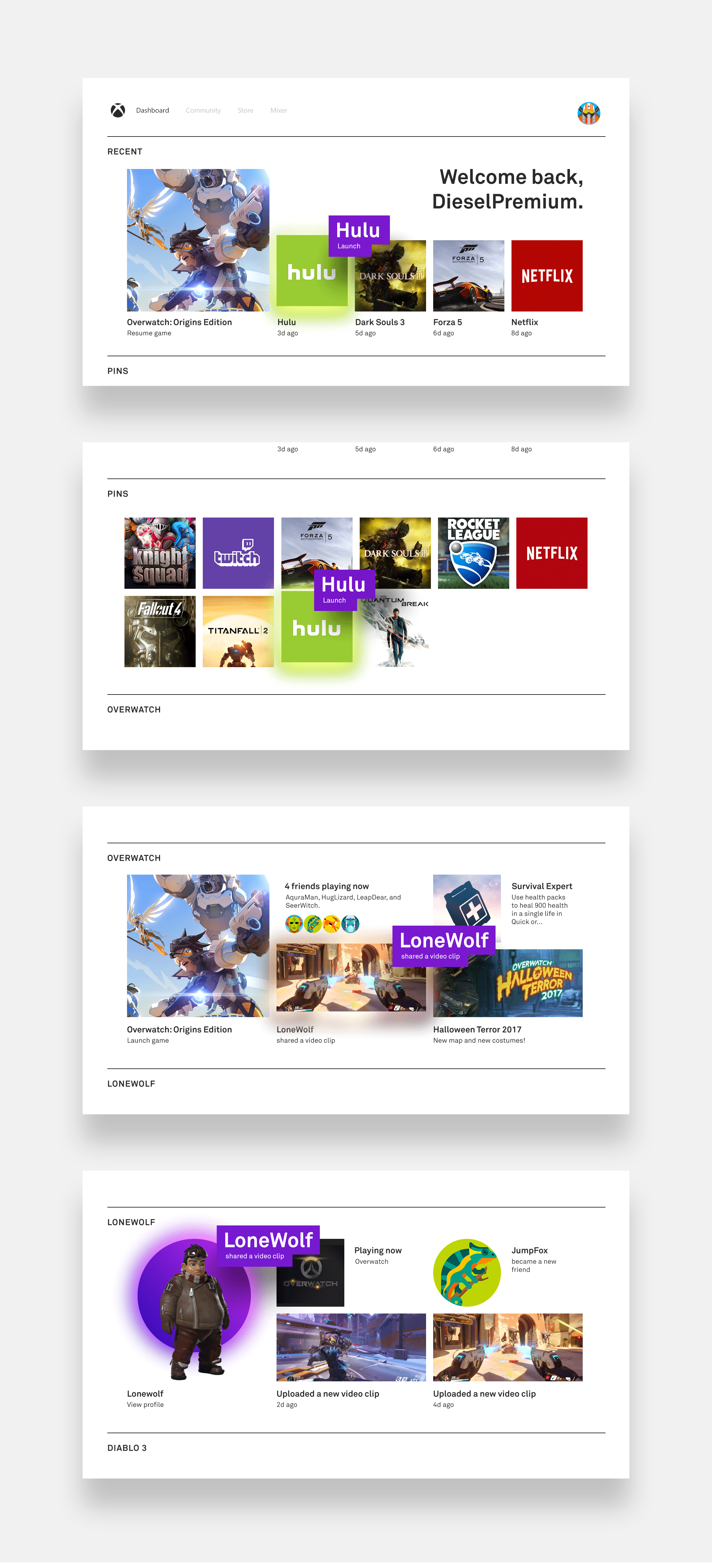 As part of the Xbox org, I explored how Microsoft’s new Fluent Design System could shape the UI for Project Scorpio, the most powerful Xbox console to date. My role was to brainstorm and illustrate a wide range of interface concepts across games, movies, messaging, and social features. I applied Fluent’s principles—light, depth, acrylic material, and subtle physicality to create modern, immersive UI explorations that pushed the console experience forward and aligned with Xbox’s design vision.