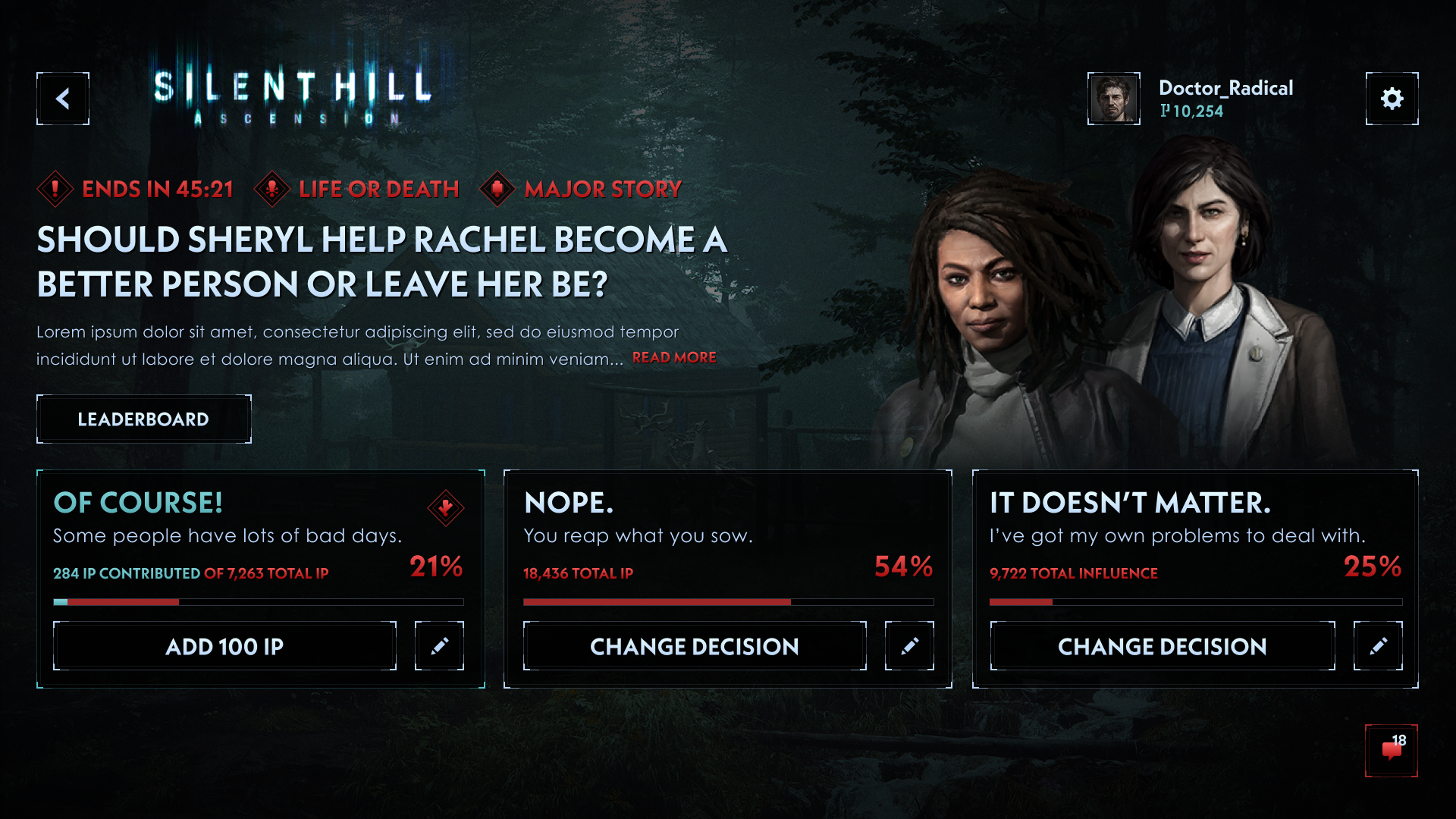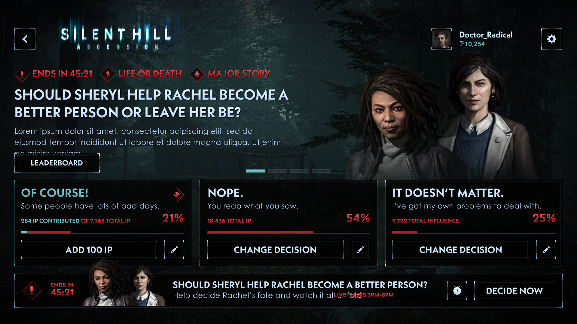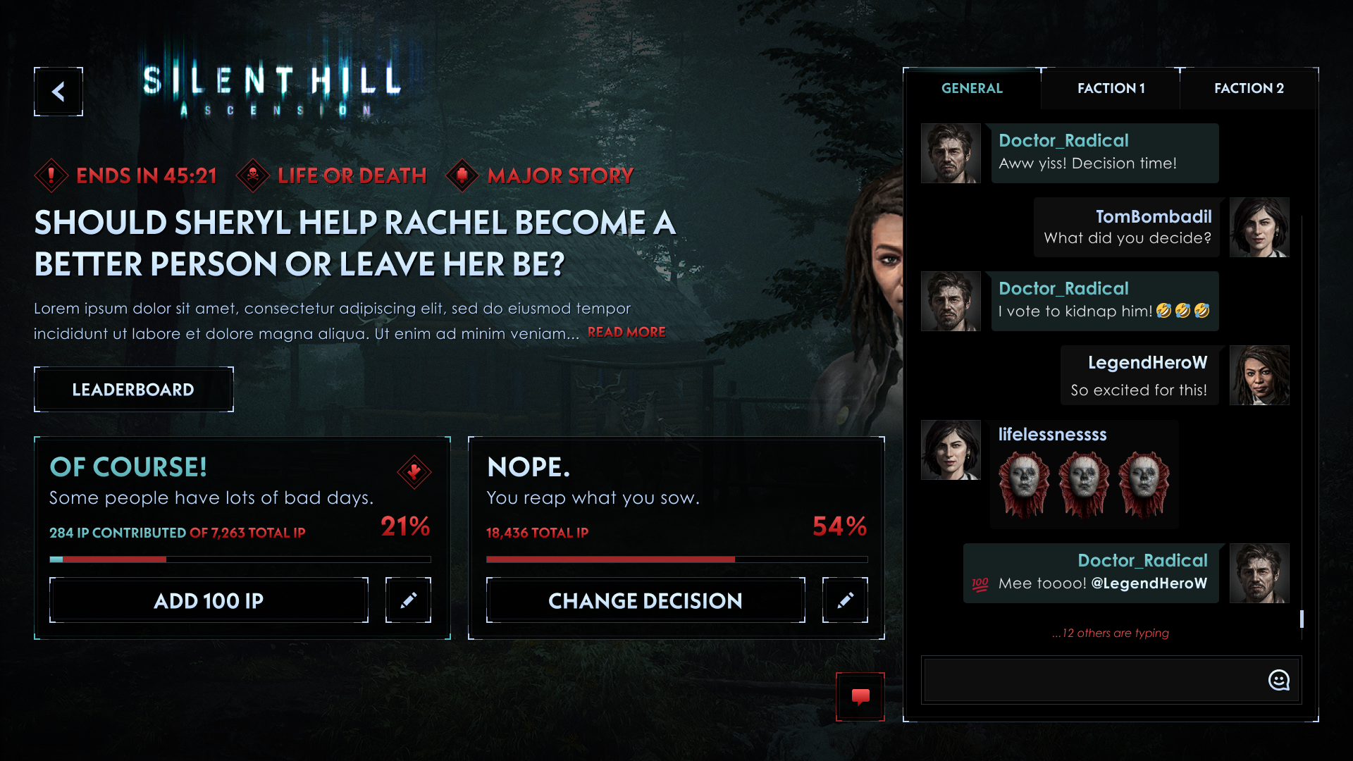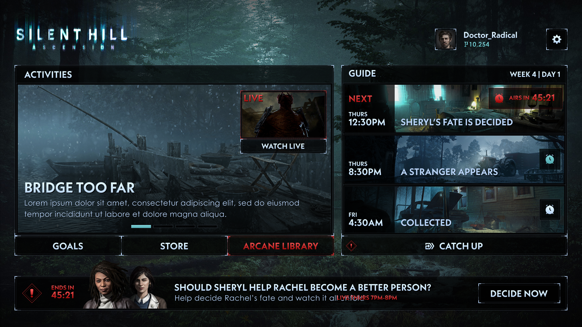 I was a UI/UX Designer on Silent Hill Ascension, a new form of interactive entertainment developed by Genvid that blended television with gaming. The experience allowed viewers to participate in live storylines by playing minigames to earn points, which were then used to vote on key narrative decisions. Votes were tallied weekly, with the story progressing based on community input. My role was to design the user experience and interface systems that supported this hybrid format, ensuring gameplay, voting, and storytelling were intuitive and engaging for a global audience.
