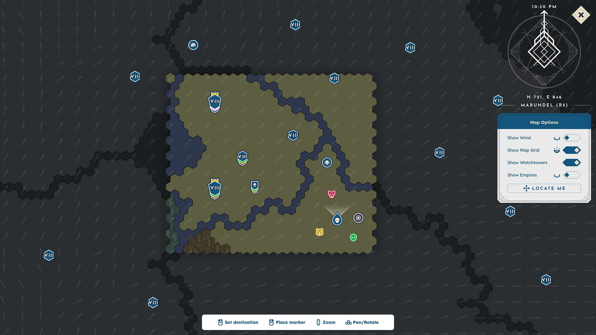 The map needed to communicate complex world-state information clearly across multiple zoom levels and in the minimap. I designed an icon system for players, creatures, ruins, claims, empires, and custom markers, while ensuring the map could support interactions such as claim previews, marker placement, and tracking. Biomes, borders, and sailing wind direction also needed to remain immediately readable.